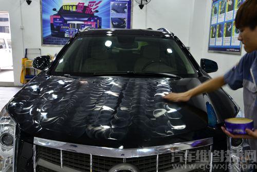 用美容粘土处理漆面以及玻璃上的异物。漆面上有很多用肉眼看不到的异物,例如有很厚的氧化层、积炭、强垢油污及铁粉、油漆等。可运用美容粘土的附着力及摩擦力去除,清除的动作完成后,漆面会产生大约2500-3000#砂纸痕迹,用微切研磨剂即可轻松去除。此外,我们还用水砂纸处理漆面表面异物。一般视漆面的状况选择不同型号的水砂纸,例如经久的油漆,可用1500#水砂纸去除;大面积的地方如车盖、车顶、车尾,可配合板擦施工;去除异物后可用2000#砂纸做修整处理,再配合研磨处理。