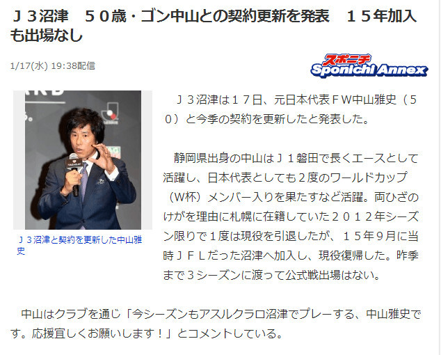 腾讯体育讯 北京时间1月17日 日本J3联赛球队沼津天蓝官方宣布,与前日本国脚前锋中山雅史完成了续约,现年50岁的中山雅史将再战职业足坛。