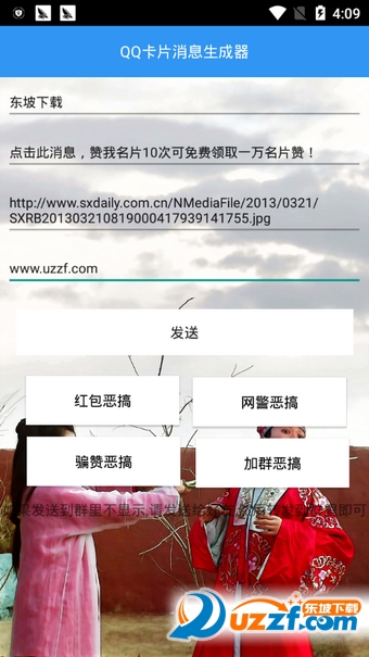 QQ整人装逼卡片生成器是一款恶搞趣味的卡片消息生成器,可以快速生成红包恶搞、网警恶搞、骗赞恶搞和加群恶搞等功能,使用简单,文字网址都能编辑。