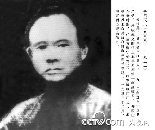 余贲民(1888-1933),湖南平江人,1922年加入中国共产党。秋收起义时任工农革命军副师长;井冈山斗争时期任红军被服厂厂长、后方留守处主任、湘赣边界工农兵政府财政部长等。1933年2月在江西省万载县小源牺牲。