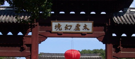 大观园走进大观园,沿着西北方草木葱郁的花径前行,穿过熙熙攘攘的"商业街",迎面是一座高约8米,三门单檐的牌楼。柱础是雕刻着莲花的须弥座,上面则是中国古代木结构特色的斗拱--飞檐长、翘角高,神采飞扬,气度不凡。牌楼上方正中额书"太虚幻境"四个大字,"太虚"意味虚空,"幻境"是指梦幻之仙境。使你尚未入得园中,临门便有了一种虚无缥缈的感觉,悟出点"假作真时真亦假,无为有处有还无"的味道来。