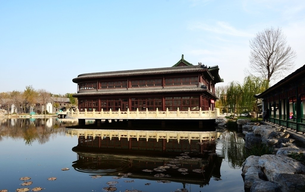 北京大观园大观楼北京大观园不仅是京华一处极富特色的人文景观,而且红学界认为它实现了《红楼梦》的梦外梦;建筑界认为它把红学艺术、古建技术和传统造园艺术的精华融于一体;园林界认为它给中国园林增加了"名著园"的新类型;文物界认为它造就了潜在的文化遗产;文艺界认为它创造了影视置景和园林建设相结合的新模式。二十年来,正是北京大观园那宛若人间仙境般的殿宇亭台、楼阁回廊、佛庵庭院、假山流水,吸引了众多影视剧组来园拍片。初步统计,二十年里有110多部电影、电视剧、专题片利用了"人间仙境大观园,梦幻红楼不夜天"的场景制作完成。