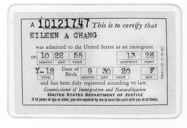 张爱玲的美国移民“绿卡”。证件显示她到美国的时间是1955年10月22日,地点是旧金山第13区第26港。