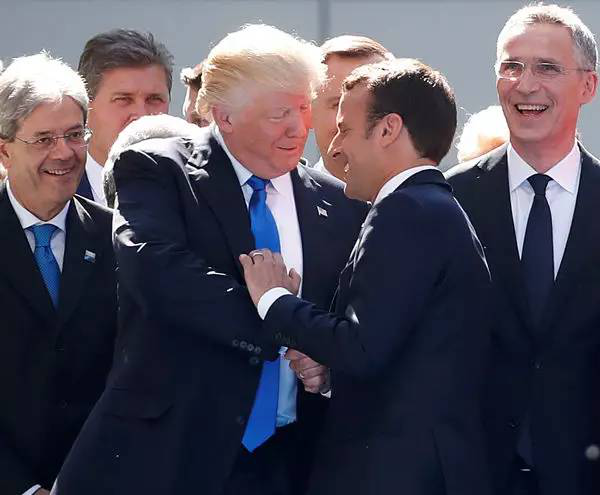 周四,在北约峰会上,在对马克龙取得法国大选的“惊人胜利”表示祝贺后,特朗普将手伸向了马克龙,然后双方进行了一场长到尴尬的握手“对决”。网络流传的照片和视频显示,两个领导人手指紧扣,脸上都现出不自然的表情。