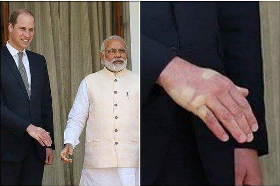 此前,威廉王子及凯特王妃于本周访问印度,由于印度总理莫迪握手十分用力,在与其握手后,威廉王子的右手竟然留下清晰的白印。